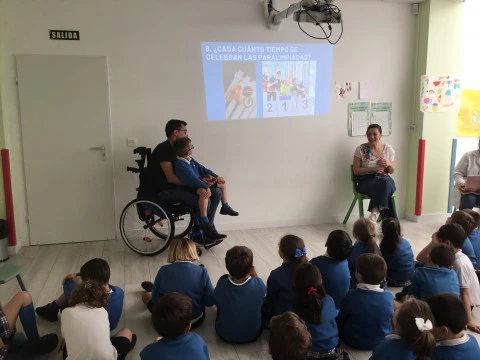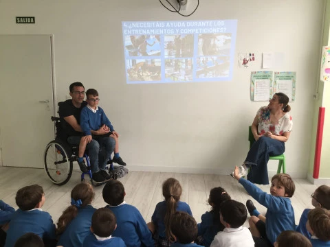 CONFERENCIAS CMP. El pasado miércoles, los alumnos de 3º de infantil recibieron la visita de Javier y su entrenadora Natalia, deportista de natación adaptada. Les habló sobre las dificultades a las que se enfrenta durante los entrenamientos y en su vida diaria. Es un luchador nato. Gracias, Javier, tu capacidad de superación es un ejemplo.